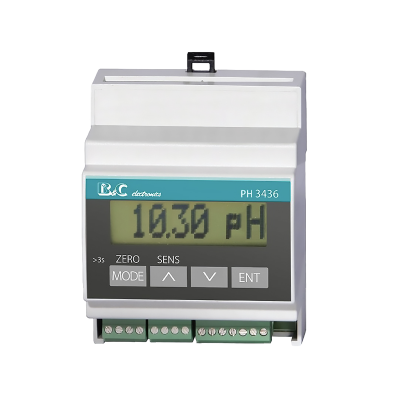 B&C Electronics PH 3436 pH/ORP Transmitter with LCD display, isolated 4-20 mA and RS485 outputs, and temperature compensation.