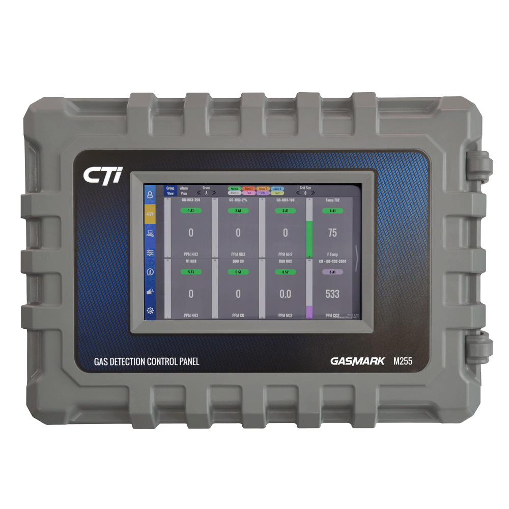 The M255 Modbus Controller is a powerful, flexible industrial control unit designed to manage large gas detection systems with ease. Supporting up to 255 connected devices, it features four Modbus channels, eight analog inputs, eight programmable relays, and a 10” color touchscreen for real-time monitoring and simple configuration.