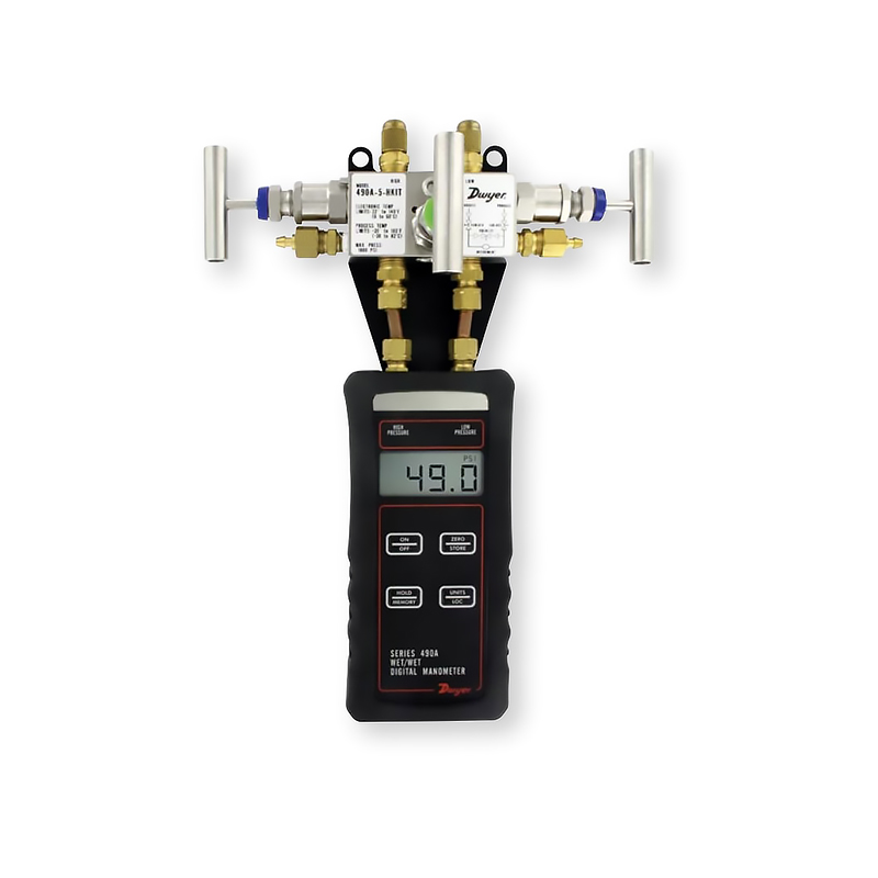 The DwyerOmega 490A Hydronic Differential Pressure Manometer HKIT includes a high-accuracy handheld meter, seven user-selectable units, and all accessories in a rugged carry case.