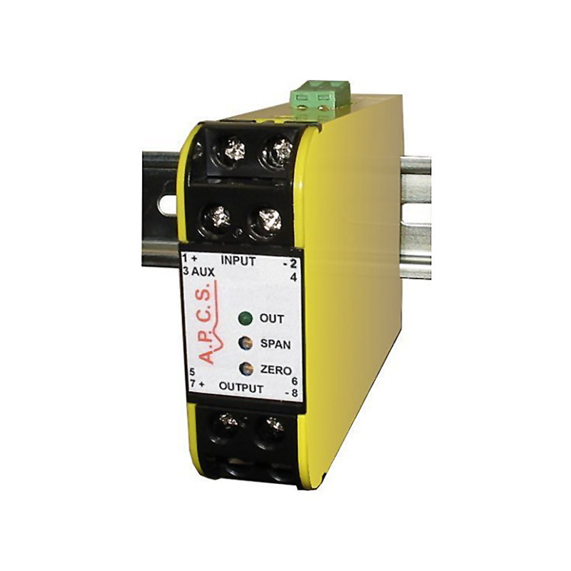 APCS SI282 Signal Isolator with 3-way galvanic isolation, selectable input ranges, auxiliary transmitter supply, and front zero/span calibration for precise signal conversion.